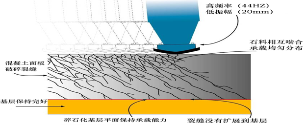 共振碎石化技术将旧混凝土面板进行了彻底破碎,形成了上层粒径为3㎝以下的碎石层和下层粒径不大于20cm的块体层,经碾压后,粒料啮合嵌挤稳定;共振碎石化后水泥板块上层粒径较小且松散,在沥青混凝土铺装层下形成应力吸收层,阻止了下层混凝土板裂缝的反射。